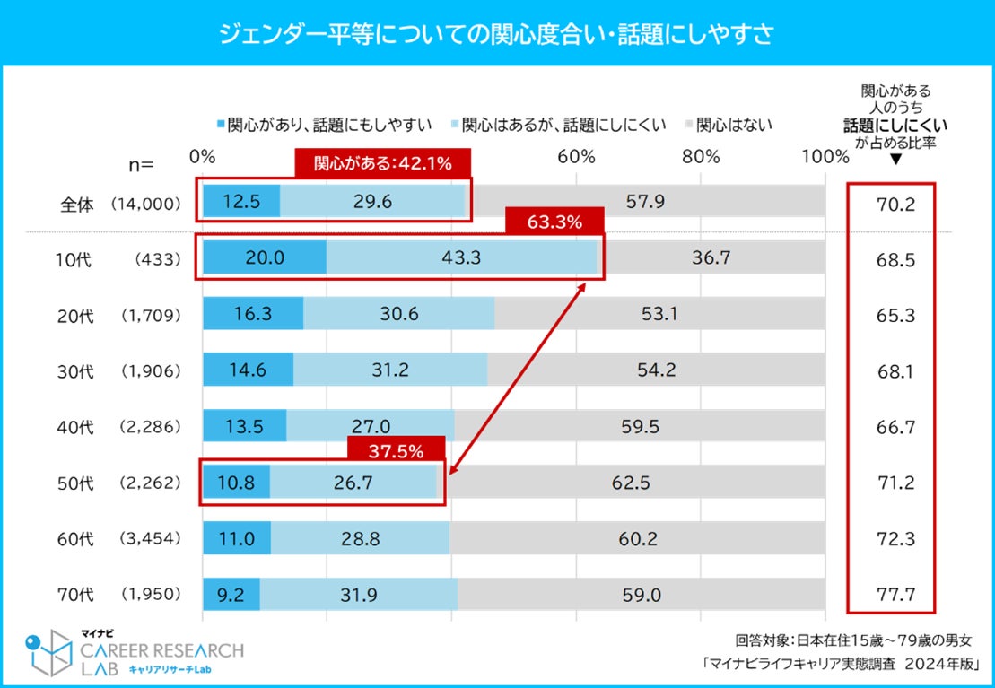 ジェンダー平等への関心と話題のしやすさについて聞くと、「関心がある」は42.1%だった。年代別にみると、「関心がある」割合が最も高いのは10代で63.3%、最も低いのは50代で37.5%となり世代間で大きく差があることがわかった。一方でいずれの年代も「関心がある」と答えた人のうち約7割は「関心はあるが、話題にしにくい」が占めている点は共通していた。【図1】