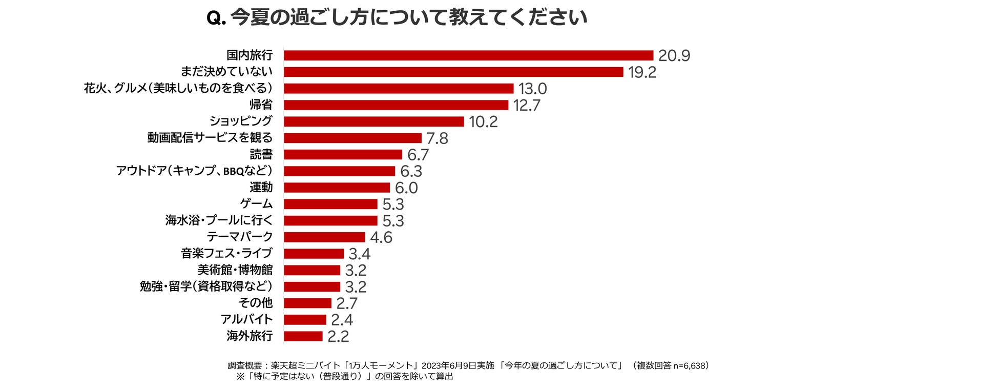 楽天が運営するマイクロタスク型クラウドソーシングサービス「楽天超ミニバイト」が実施した「今年の夏の過ごし方」に関する調査(注1)によると、今夏の過ごし方は「国内旅行」(20.9%)が最も多く約5人に1人が計画している一方、「動画配信サービスを観る」(7.8%)や「読書」(6.7%)も上位にランクインしました。また、「今年の夏の予定に対する予算」をたずねたところ、約4人に1人が昨年比で「予算を増やす(増える)予定」と回答しました。