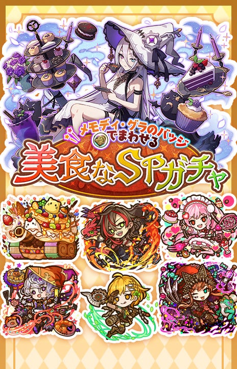 対象ダンジョンのクリア報酬で獲得できるイベントポイント「メモディ・グラのバッジ」で、新キャラクターである「美茶会の魔女ベファーナ」の他、「美食テイマー『鳳竜』ゼシア」、育成素材などがラインナップされたSPガチャを楽しめます。