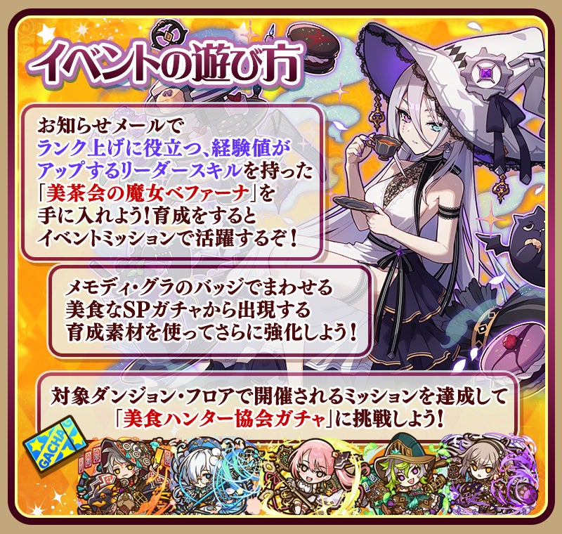 本イベントは、新登場のキャラクター「美茶会の魔女ベファーナ」や最大50個の「光結晶」が手に入るログインボーナスをはじめ、新たなガチャやダンジョン、モンスター討伐など、盛りだくさんの内容でお届けします。美食ハンターたちの舌を唸らせる“美食イベント”をどうぞご賞味ください。