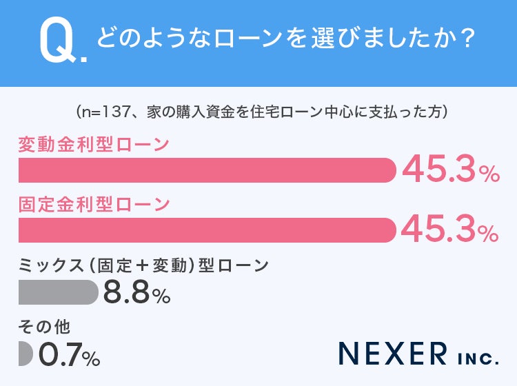 住宅ローンの種類は「変動金利型」と「固定金利型」がそれぞれ45.3%と同率首位となりました。