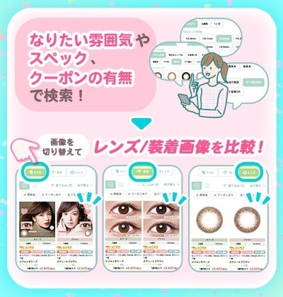 今回のリニューアルでは、より一層お客様にご利用いただきやすいサイトを目指し、新制度や新機能を導入。新たに始まる「会員ランク制度」は、過去1年間のご利用結果に応じて会員ランクが5つに分かれており、ランクアップするごとにポイント獲得率などもアップしていくものです。また、なりたい雰囲気や商品スペックはもちろん、“クーポンの有無”など多様なお客様のニーズにお応えした商品検索機能もリニューアル。検索結果は「レンズ画像/装着画像」を簡単に切り替えて確認することができ、レンズイメージの比較も手軽にできるようになりました。