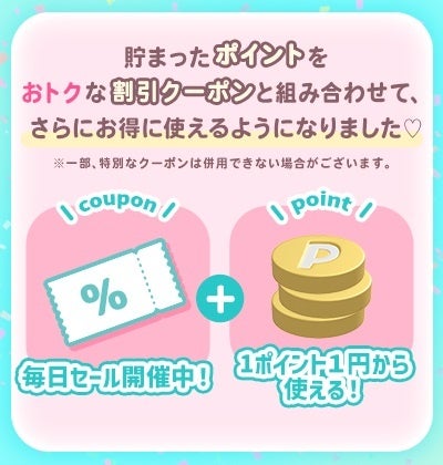 この他にも、商品購入などで獲得したポイントと毎日配布されているセールクーポンとの併用が可能となり、さらにお得に商品をお求めいただけるようになりました。今後も“自分史上最高にかわいい、あたらしい私”というコンセプトのもと、“安心・安全に可愛くなれる”ことをモットーにECサイトの運営に取り組んでまいります。