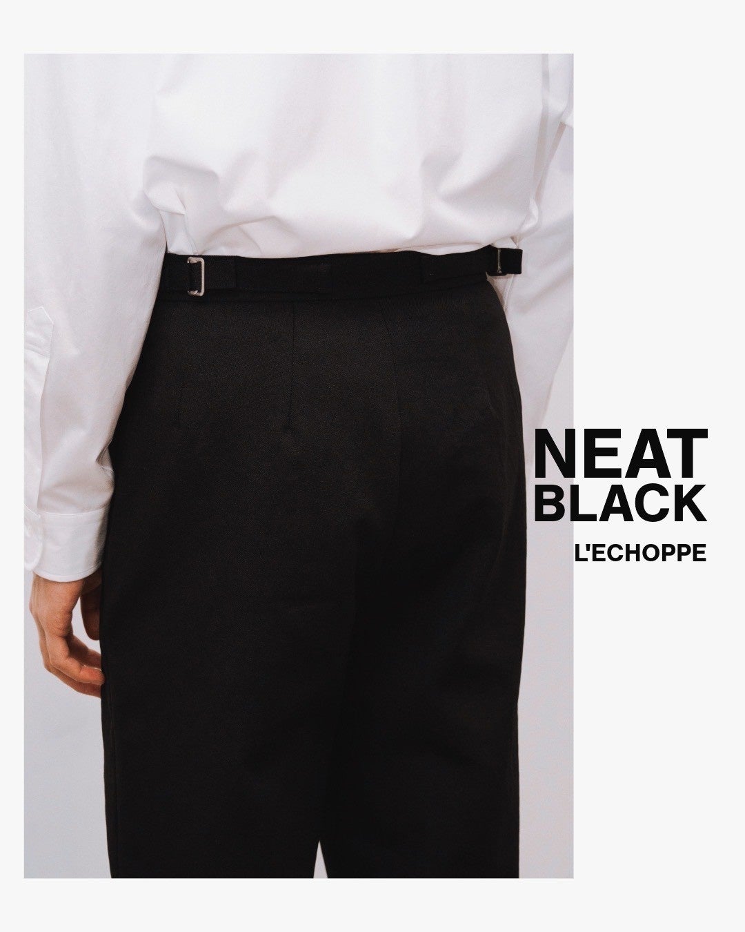 ニートの特徴である深いプリーツやワイドシルエットに高級感のあるブラックのポリエステルを合わせることで、90年代の日本のモードの雰囲気を持ったものになり得る。そんな目論見を西野氏に持ちかけると、彼はちょうどカール・ラガーフェルドが手掛けてきた錚々たるメゾンブランドのアーカイブに注目していたそう。そこで普段のニートと異なる、ウィメンズのドレスウェアの縫製工場で生産することが決まった。ややワイドなシルエット。フロントのツーインプリーツ。ヒップにはダーツを二つ入れて、腰回りはミニマムなフィットに。ベルトループを廃してサイドアジャスターで調整する。色気と実用が交差する、「NEAT BLACK」が形になった。