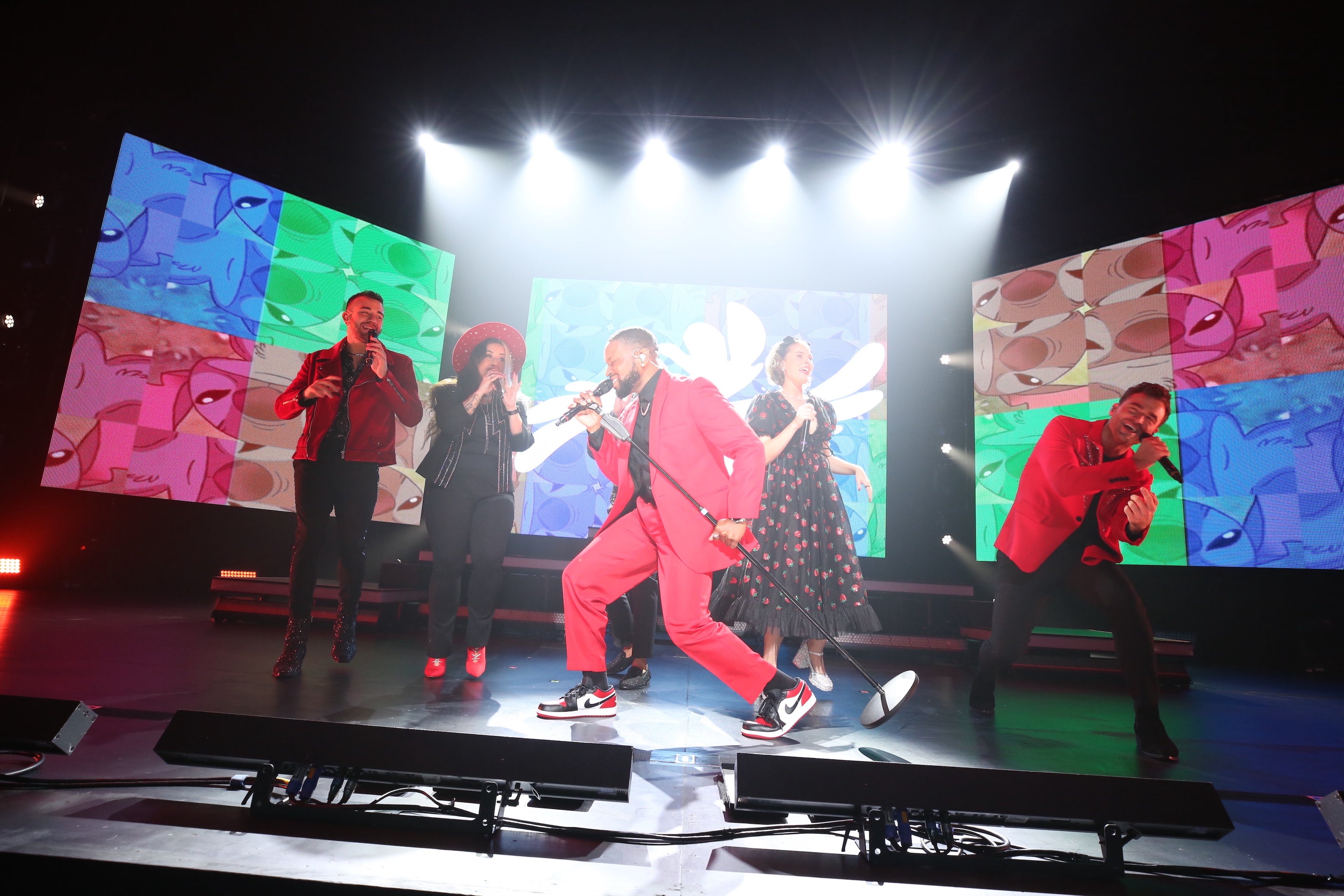 他にも今回初披露となるメドレーがふたつ。まずひとつは、映画『インクレディブル・ファミリー』からのメドレーで、ヴォイス・パーカッション以外にギターやトランペットの演奏が挟み込まれるのだけれど、あまりにリアルな音と振り付けで踊りながらのパフォーマンスで必死に目で追ってもギターが誰の声なのかわからない。誰? 誰なの?と探す気持ちにまた高揚感を煽られる。もうひとつの『ポカホンタス』のメドレーは、プロデューサーのディーク・シャロンではなく、メンバーのRJ・ウェスナーがアレンジを担当。ケイレン・ケリーとモーガン・キーン、2人の女性をフィーチャーするアレンジは、メンバーの個性をより生かしていきたいという方向性が見え隠れする。前半の終盤で、目の前で観ていてもひとりで全ての音を出しているとは信じ難いヴォイス・パーカッションのアントニオ・フェルナンデスがソロでパフォーマンス。その魅力は、磨かれたテクニックだけではなく、とってもチャーミングなのだ。観客を巧みに巻き込みつつ、笑顔で展開されるパフォーマンスになんだかミッキーマウスの姿が重なって見えてくるほどだ。