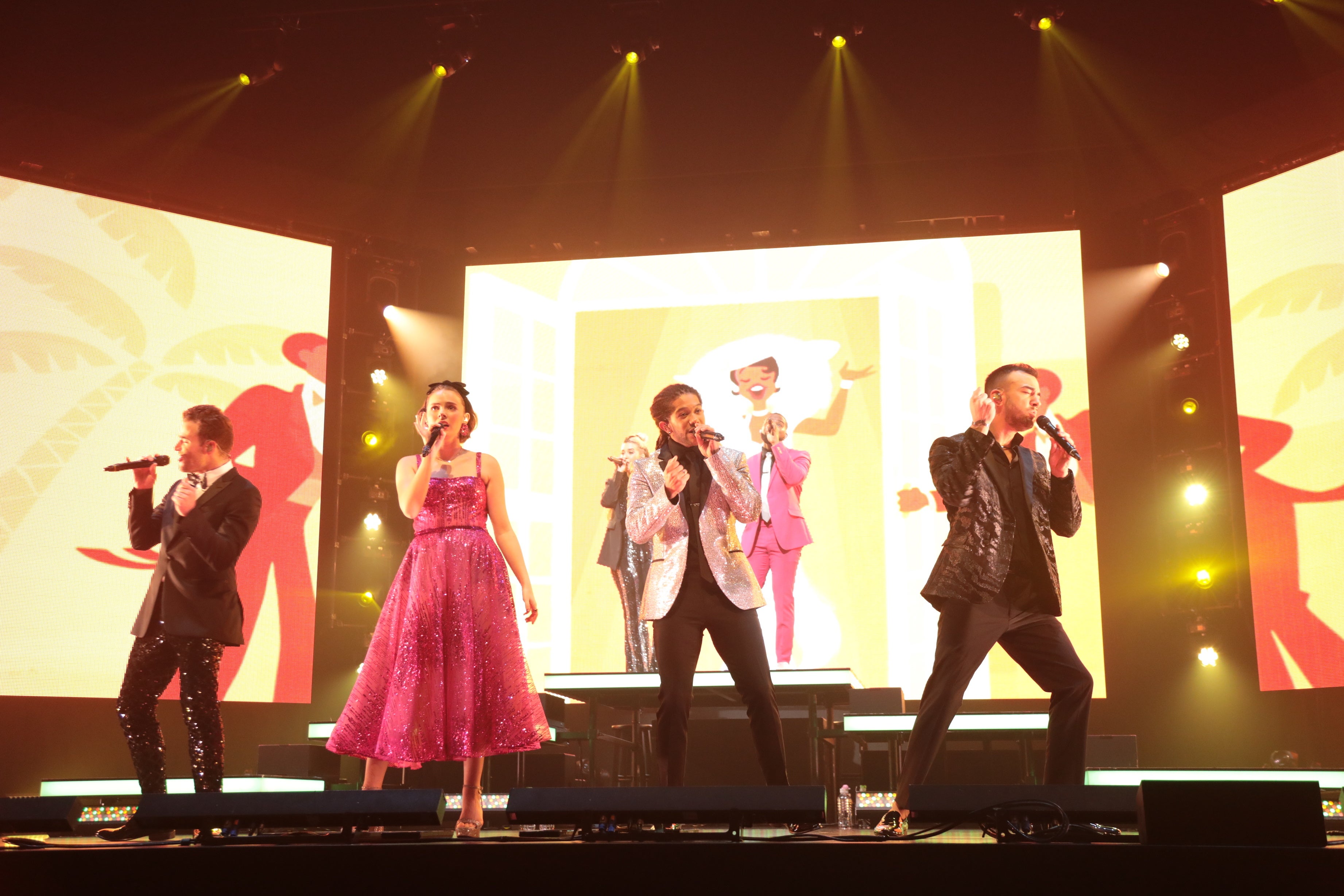 今回もまたステージ後方に巨大モニターが3台。ほとんどの楽曲で映画のシーンが映し出されるのも、ディカペラのコンサートならではの楽しみだ。