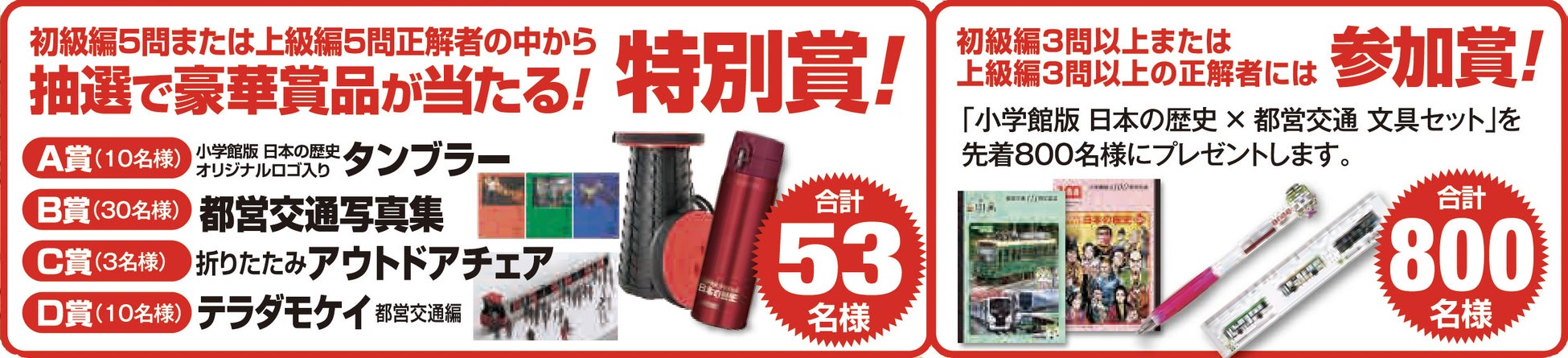 特別賞: 初級編、上級編のいずれか5問正解された方の中から抽選で、合計53名様に「小学館版 日本の歴史」オリジナルロゴ入りタンブラーや都営交通写真集などのグッズをプレゼント。