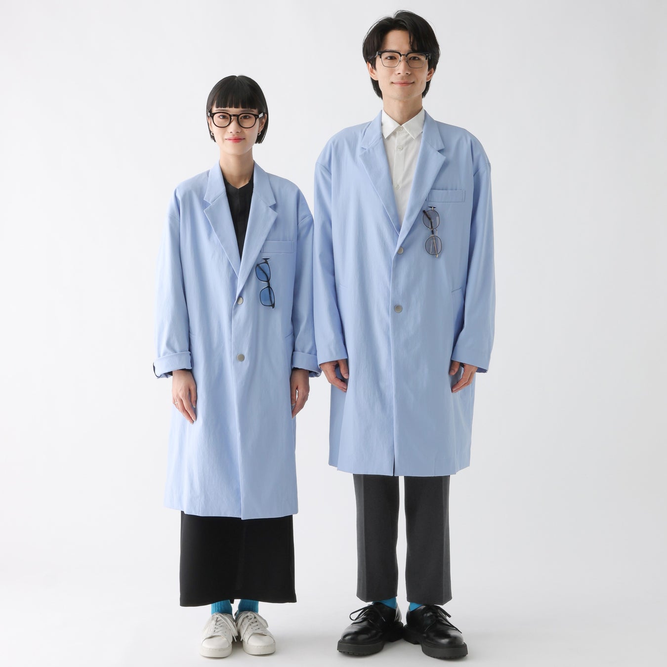 視覚に映え、清潔感あふれるサックスブルーのテイラードコートデザインです。トラディショナルでありながら緩やかなシルエットは、圧迫感が無く、ストレスフリーな着心地を実現しました。着る人の体型に沿ってキレイに落ちる肩の形状は、サイズの選択により、年代や体型、ジェンダーを問わず、好みのシルエットで着られます。ユニフォームのイメージを見つめ直し、着る人にとっての快適さを追求したシルエットです。