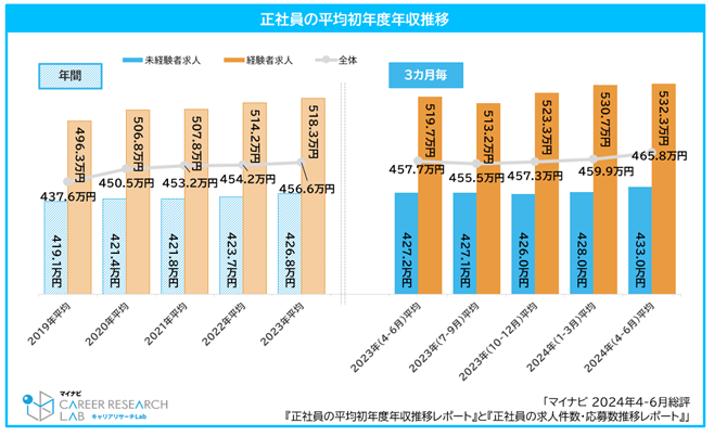 ◆24年4-6月の平均初年度年収は465.8万円(未経験者:433.0万円、経験者:532.3万円)