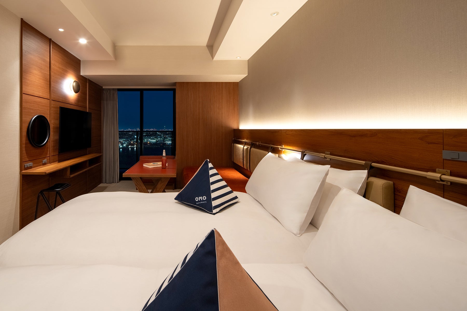 また、客室「デラックスツインルーム」や「OMOハウス」は、船のキャビンをイメージした温かみのあるデザインです。船の帆をイメージしたクッションや、革のストラップで支えられたヘッドボード、真鍮色のレールにより、クラシックな船旅の雰囲気を演出しています。