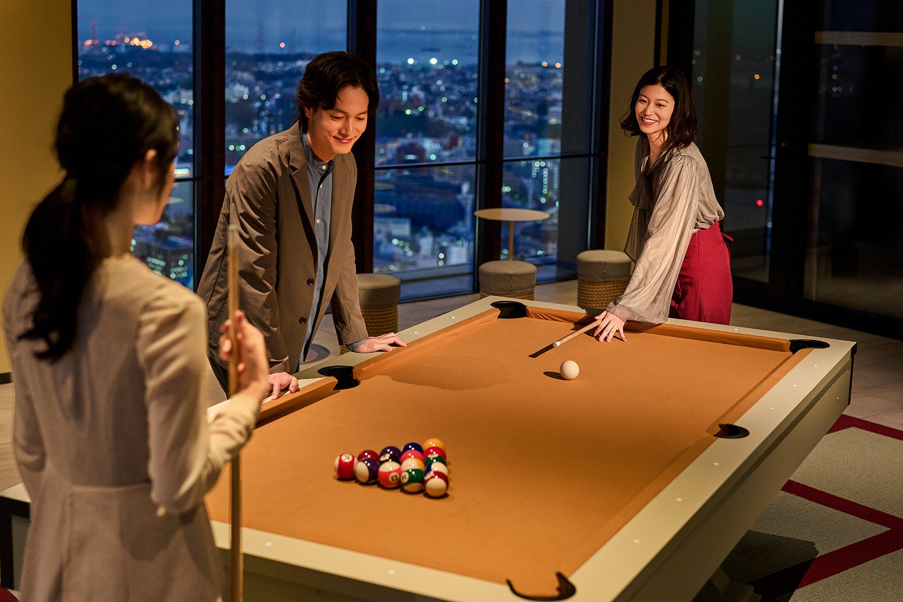 また、夜景を眺めるだけでなく、ビリヤードをはじめとする4つの「Play Zone(プレイゾーン)」で遊んだり、洋画が流れるシアタールームでくつろいだり、夜景に囲まれながら過ごすこともできます。