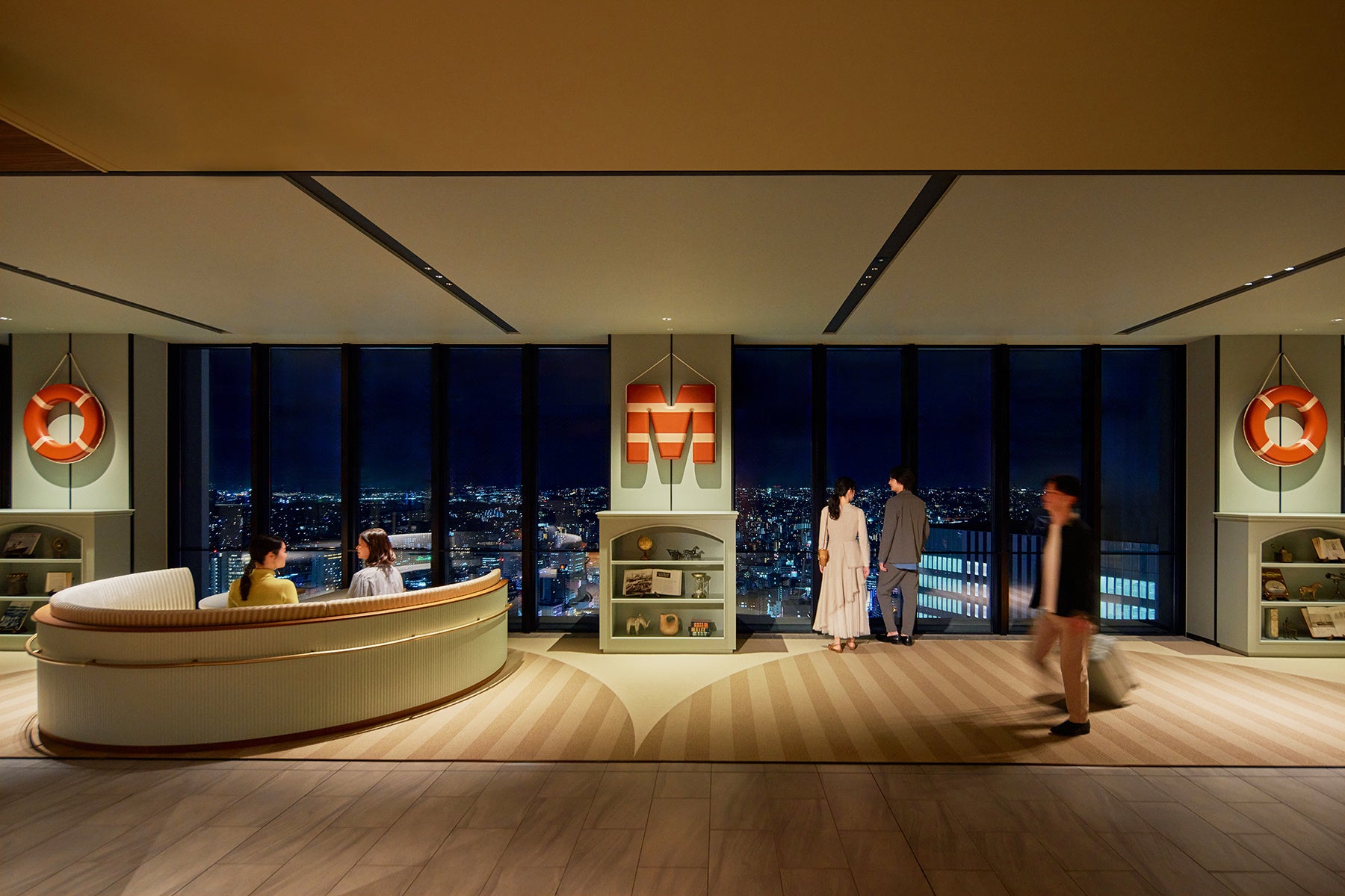 パブリックスペース「OMOベース」は回廊式となっており、地上154mから横浜の景色を360°一望できます。大きな窓が一面に広がるエントランスや、日が暮れると光が浮かび上がる「Night View Deck(ナイトビューデッキ)」から夜景を、海側にある「Bay View Deck(ベイビューデッキ)」から、朝日に照らされ輝く港町を眺め、一日中景色の移ろいを楽しめます。