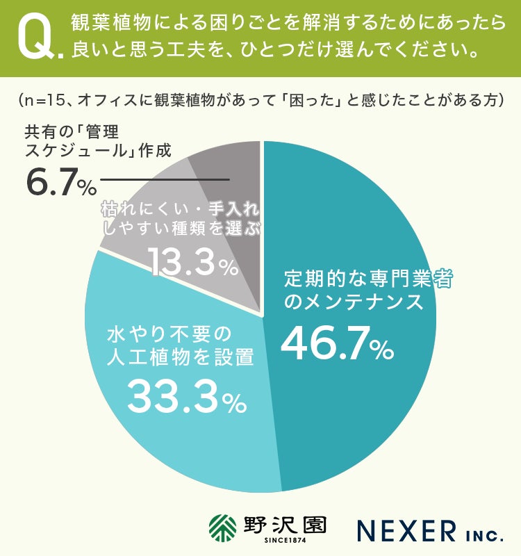 続いて「水やり不要の人工植物を設置」が33.3%「枯れにくい・手入れしやすい種類を選ぶ」13.3%となりました。