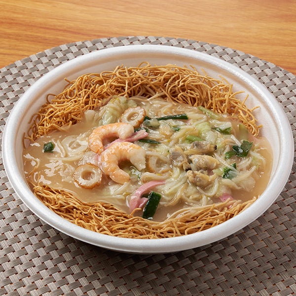 【内容】パリパリの食感が特長の皿うどんです。鶏白湯をベースに魚介だしやウスターソースを加えた旨みのある餡に、あさり、海老、野菜炒めを盛りつけました。