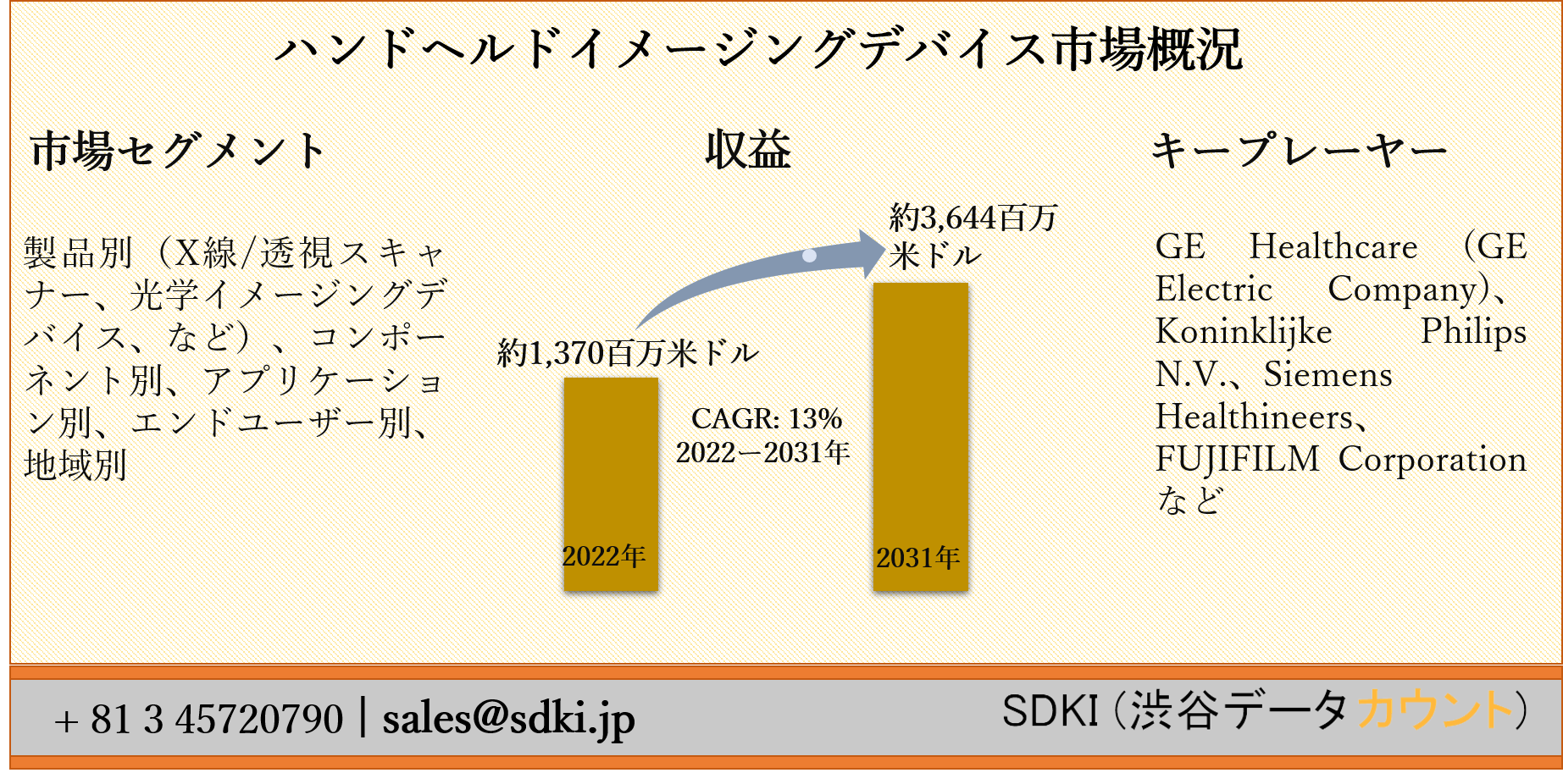 SDKI Inc.は、「ハンドヘルドイメージングデバイス市場ー世界の予測2022ー2031年」新レポートを 2022年02月21日に発刊しました。この調査には、ハンドヘルドイメージングデバイス市場の成長に必要な統計的および分析的アプローチが含まれています。レポートで提供される主要な産業の洞察は、市場の既存のシナリオに関する読者に市場の概要についてのより良いアイデアを提供します。さらに、レポートには、市場の成長に関連する現在および将来の市場動向に関する詳細な議論が含まれています。