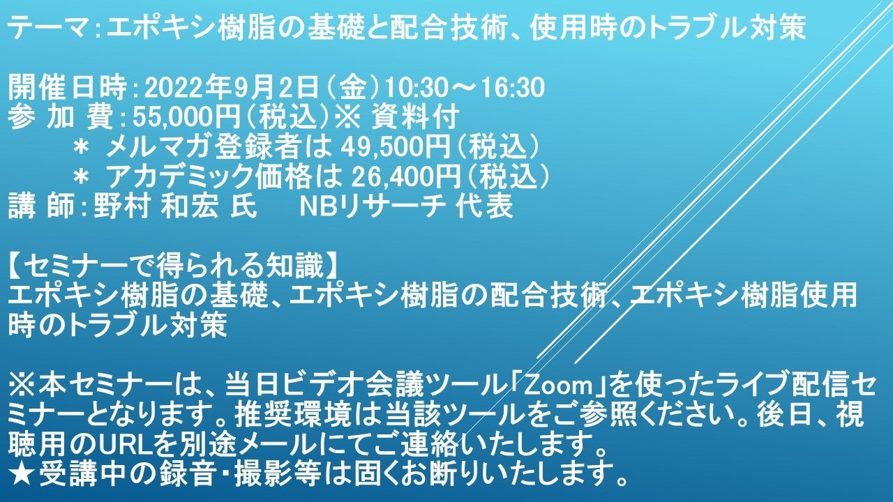 先端技術情報や市場情報を提供している(株)シーエムシー・リサーチ(千代田区神田錦町: https://cmcre.com/ )では、 各種材料・化学品などの市場動向・技術動向のセミナーや書籍発行を行っておりますが、 このたび「エポキシ樹脂の基礎と配合技術、使用時のトラブル対策」と題するセミナーを、 講師に野村 和宏 氏 NBリサーチ 代表)をお迎えし、2022年9月2日(金)10:30より、 ZOOMを利用したライブ配信で開催いたします。 受講料は、 一般:55,000円(税込)、 弊社メルマガ会員:49,500円(税込)、 アカデミック価格は26,400円(税込)となっております(資料付)。