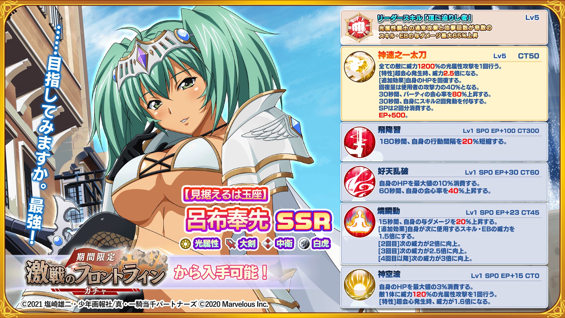 本日開始の「激戦のフロントラインガチャVol.1」では、新たに「【見据えるは玉座】呂布奉先」(CV:渡辺 明乃)が登場。