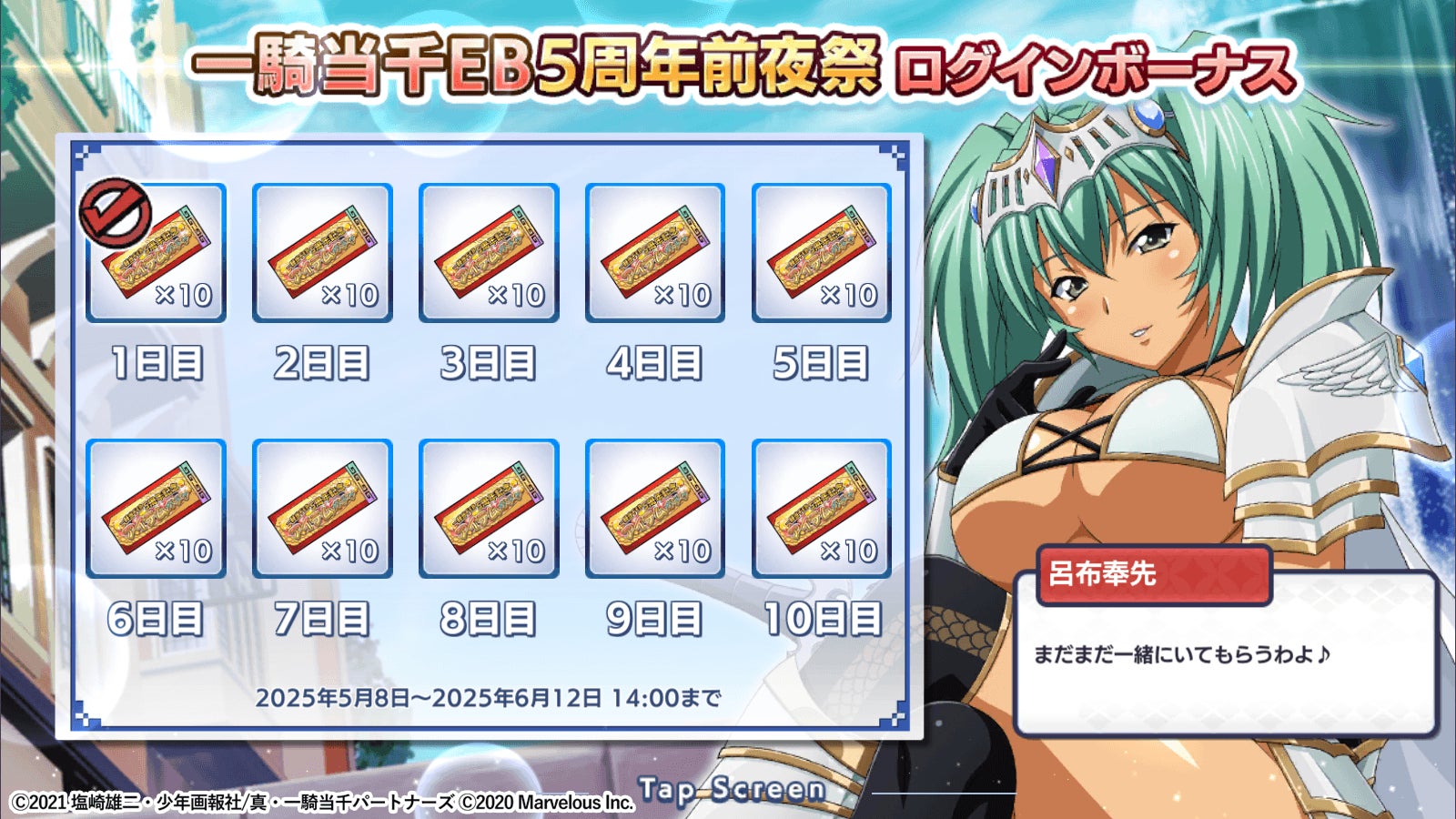 「一騎当千EB5周年記念アイテムガチャチケット」が毎日手に入るログインボーナスを開催中!
