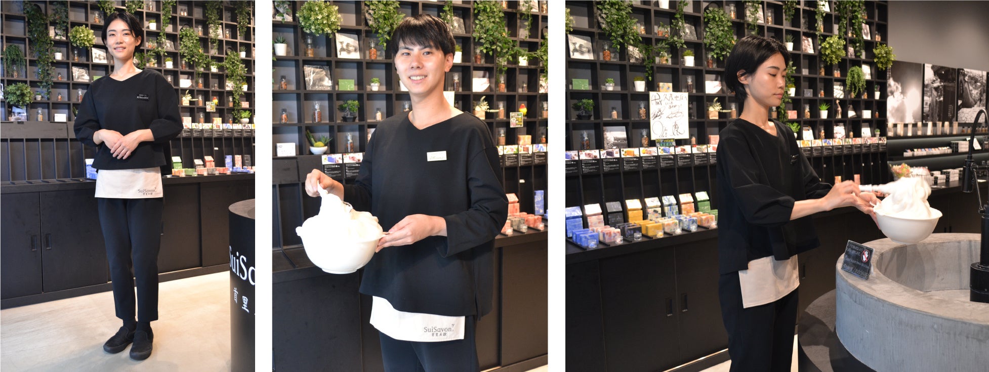 新ユニフォームのベースとなるセットアップのカラーには、「SuiSavon-首里石鹸-」の店内空間の落ち着いた黒とグリーンになじむ黒をセレクト。そこにハンドメイド石鹸から始まったブランドであることの象徴として、エプロンを組み合わせ、ものづくりにこだわるブランドの姿勢を表現しました。