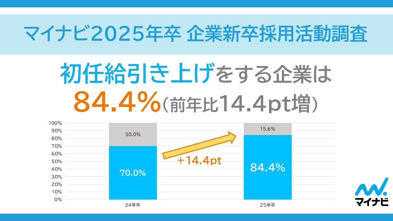 インターンシップ実施率は61.3%でコロナ禍前を超え調査開始以来最高。初任給引き上げを実施する企業は84.4%(前年比14.4pt増)。引き上げ幅は拡大傾向で「1万円~2万円未満」が最多