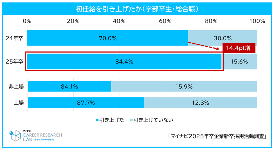 学部卒生の総合職採用について、直近で初任給の引き上げを行った企業は84.4%となった。前年の70.0%から14.4pt増加し、上場企業・非上場企業ともに8割を超える企業が初任給を増額した。