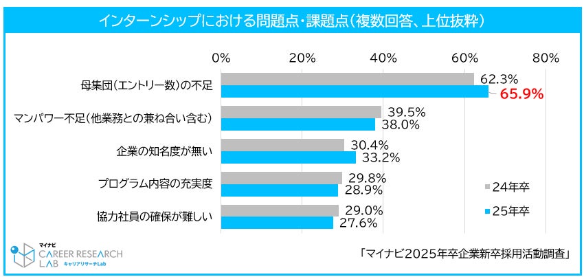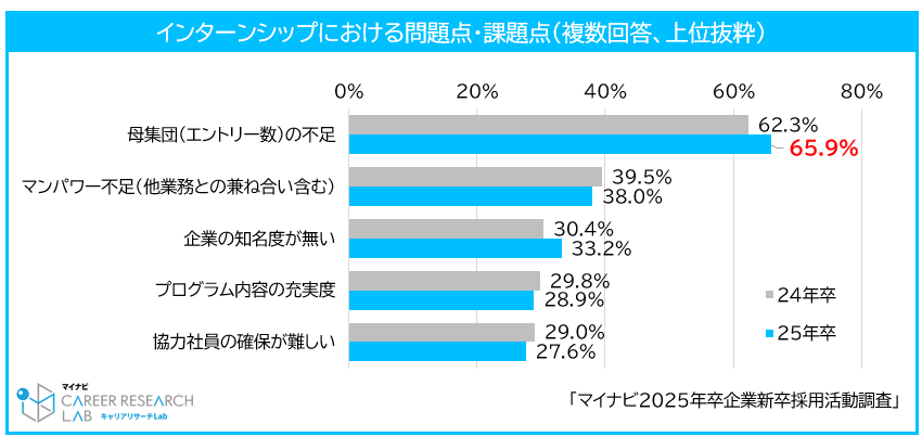 インターンシップの実施率は3年連続で増加し、61.3%となった。経年で比較すると、22年卒はコロナ禍のため、48.0%まで減少したが、その後は毎年上昇を続け、25年卒では調査開始以来最高値となった。インターンシップの問題点・課題点は前年同様に「母集団(エントリー数)の不足(65.9%)」が最多で、前年より3.6 pt増加した。学生の参加状況をみると応募・参加割合ともに高い水準を保っているが、企業の実施率も増えているため、参加人数の確保が難しくなっていると考えられる。【図1、2、3】