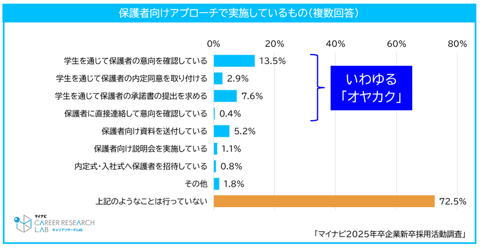 ◆学生を通じて保護者の意向を確認している企業は13.5%。全国転勤や退職金を理由に子供の内定承諾を反対する事例も