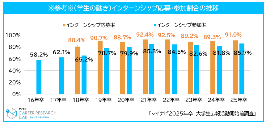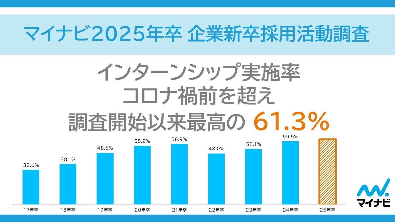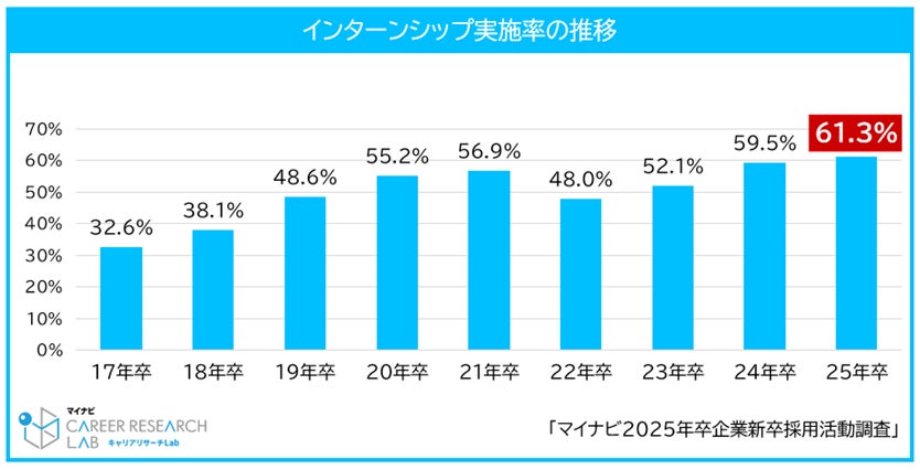 25卒インターンシップ実施率は61.3%。コロナ禍前を超え、調査開始以来最高値【図1、2、3】