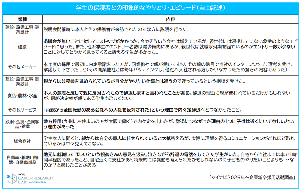 企業が学生の保護者に対して行っているアプローチを聞いたところ、「行っていない」という回答が72.5%で多数派となった。企業から保護者に内定確認の連絡をする、「オヤカク」の内容も見られ、「学生を通じて保護者の意向を確認している」が13.5%で最多だった。次いで「学生を通じて保護者の承諾書の提出を求める(7.6%)」が多く、「学生を通じて保護者の内定同意を取り付ける(2.9%)」、「保護者に直接連絡して意向を確認している(0.4%)」が続いた。また、保護者との印象的なエピソードを聞くと、「『両親から全国転勤のある会社への入社を反対された』という理由で内々定辞退へとつながった」や「退職金が無いことに対して、ストップがかかった。今やそういう会社は増えているが、親世代には浸透していない」といった声も寄せられた。【図8、9】