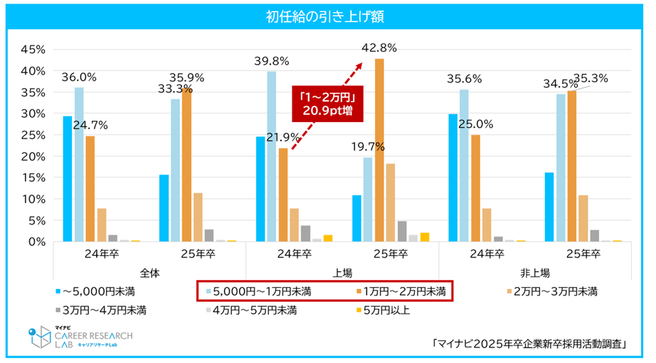 初任給の引き上げを行った企業は84.4%で前年比14.4pt増加。引き上げ幅は「1万円~2万円未満」が最多で上場企業では前年の約2倍に【図6、7】