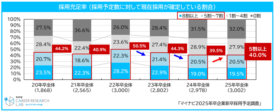 6月時点の採用充足率が5割以上の企業は23年卒以降2年連続で減少していたが、25年卒では前年比0.5pt増の40.0%で微増した。詳細を見ると「8割以上」が24年卒の19.0%から0.5pt増加している一方で「0割」も0.5pt増となっており、採用充足率が高い企業と低い企業の差がやや広がっている様子もうかがえる。