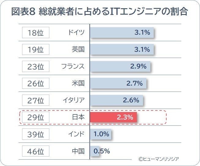 G7ではドイツが最も高く3.1%で18位、G7の平均(カナダを除く6カ国)は、2.8%でした。一方日本は2.3%で29位とG7で最下位であり、先進各国と比較して低い結果となりました。国内で労働人口減少が加速する中、業務効率化や自動化の推進を担うIT人材の「密度」が低い実態が、DX推進の足かせとなることが懸念されます。