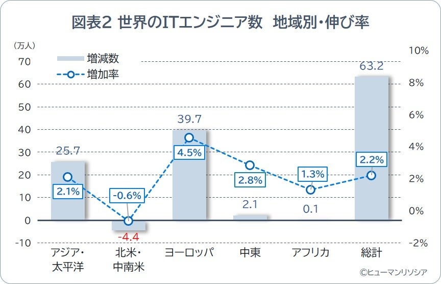 世界各国でITエンジニアとして働いている就業者数について、データを取得できた計114カ国を対象に調査・集計したところ、総計で3,023.2万人でした。前年より63.2万人増え、対前年での伸び率は2.2%でした。前回調査(※1)での対前年での伸び率は6.1%であり、増加率は縮小しています。地域別ではヨーロッパが39.7万人増え、前年比で4.5%増と高い伸び、特に東欧エリアが12.0%増と大きく増えています。