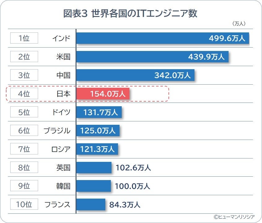 •日本のITエンジニア数は154.0万人、前年比6.9%増と高い伸び率で世界4位を維持
