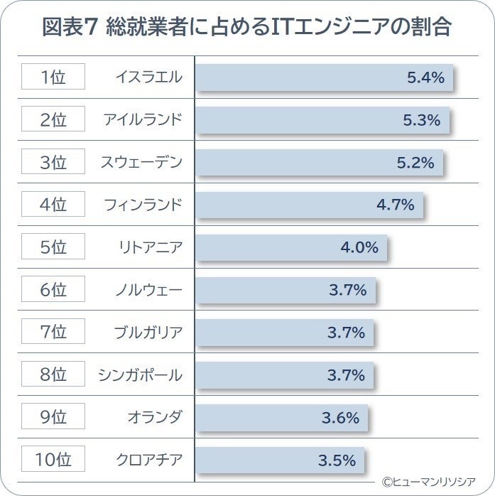 続いて、総就業者に占めるITエンジニア比率(=IT人材の“密度”)を算出すると、最も高いのはイスラエルで5.4%でした。そして、アイルランド(2位)、スウェーデン(3位)、フィンランド(4位)、リトアニア(5位)、ノルウェー(6位)と、これまでの調査同様に、北欧諸国が上位に並びました。