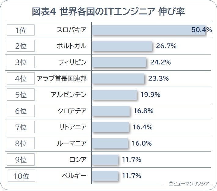 対前年での伸び率を国別でみると、1位は50.4%増と大幅増のスロバキアで、2位はポルトガル(26.7%増)、3位はフィリピン(24.2%増)も大きく伸長しています。ウクライナと国境を接するスロバキアとポーランド(11位)が上位に入っており、国際情勢に伴う人材移動やIT拠点の再配置の影響が考えられます。