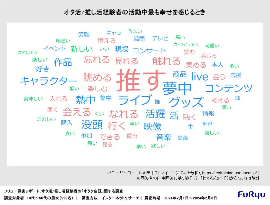オタク自認者に「オタ活/推し活においてもっとも幸せな瞬間はいつですか?」と質問すると、「ライブ/コンサートを観ているとき」「好きな作品を読んでいるとき」「グッズを入手した瞬間」など、好きな対象に接触している瞬間が幸せであるという意見が多くあがりました。そのほかにも、「好きな作品が評価されたるとき」「推しが頑張っている姿を見たとき」など、対象の喜びに共感し幸せを感じるという声や、「友人と推しについて語り合っているとき」など好きな気持ちをだれかと共有しあうことで幸せを感じる方声もあがりました。