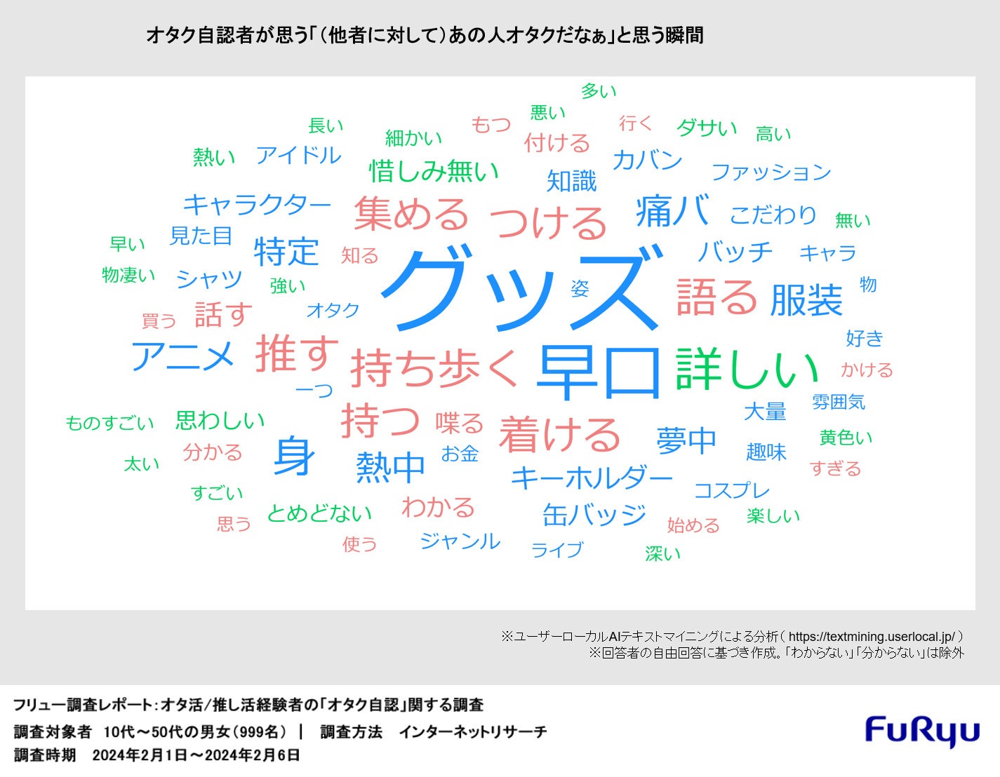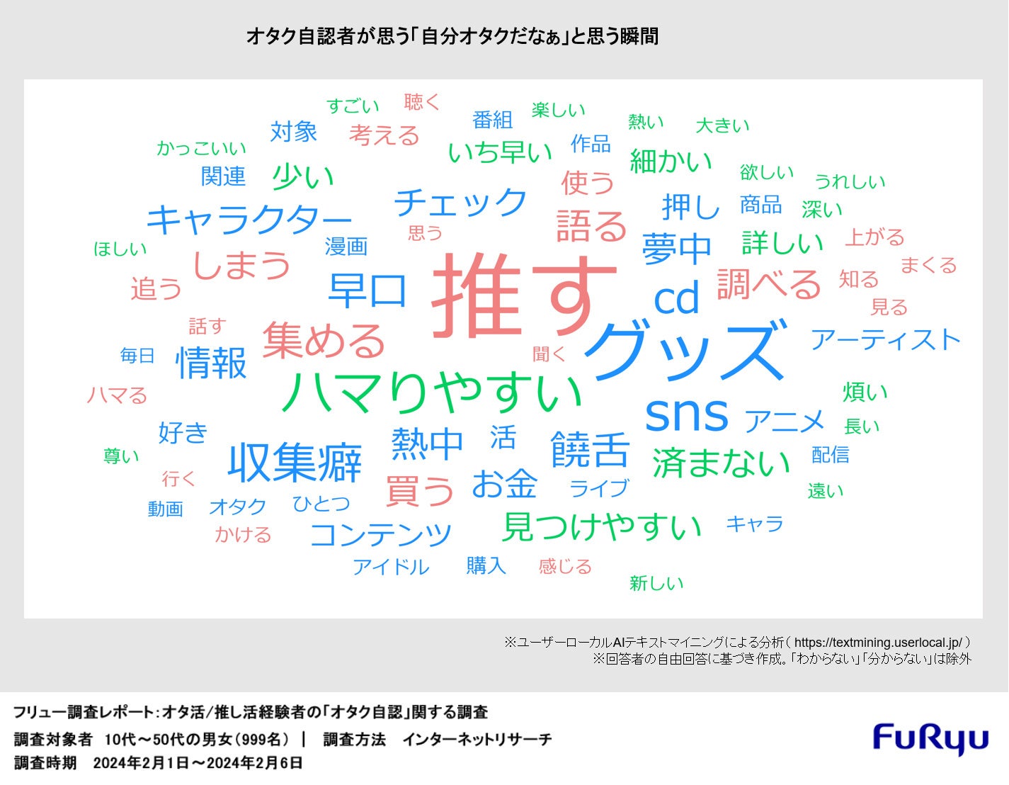 オタク自認者に対して「自分はオタクだなぁと思う瞬間」を聴いた質問では、自由回答記述内の単語を計測すると「買う/課金(35回)」「お金(26回)」「情報(24回)」といった単語が目立ちました。またエピソードとしては「グッズを大量に買ってしまう」「収集癖がある」といった自身の購買行動に関する事柄が多くあげられました。また「あの人オタクだなぁと他者を見て思う瞬間」を聞くと、「グッズ(153回)」「持っている/持ち歩く(56回)」「早口(36回)」といった単語が目立ち、「グッズを持ち歩いている/身に着けている」「推しのことを話すときに早口になる」といった、見た目や何気ない行動に関するエピソードが多くあがりました。一方「自分がオタクだなぁと思う瞬間」については「~してしまう」という表現も目立ち(22回)、自身の行いについて振り返って反省している傾向も見られました。オタク自認者は、オタ活/推し活に時間やお金を使うことについて自制が効かない瞬間があるのかもしれません。