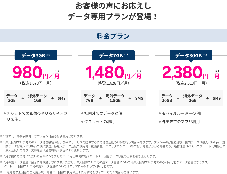 月間データ容量が3GBの場合は980円(税込1,078円)、7GBの場合は1,480円(税込1,628円)、30GBの場合は2,380円(税込2,618円)の3プランからお選びいただくことができ、音声通話が不要なソフト開発用やタブレット用など、より様々なビジネスシーンにて「楽天モバイル法人プラン」をご利用いただけます(注7、8、9)。