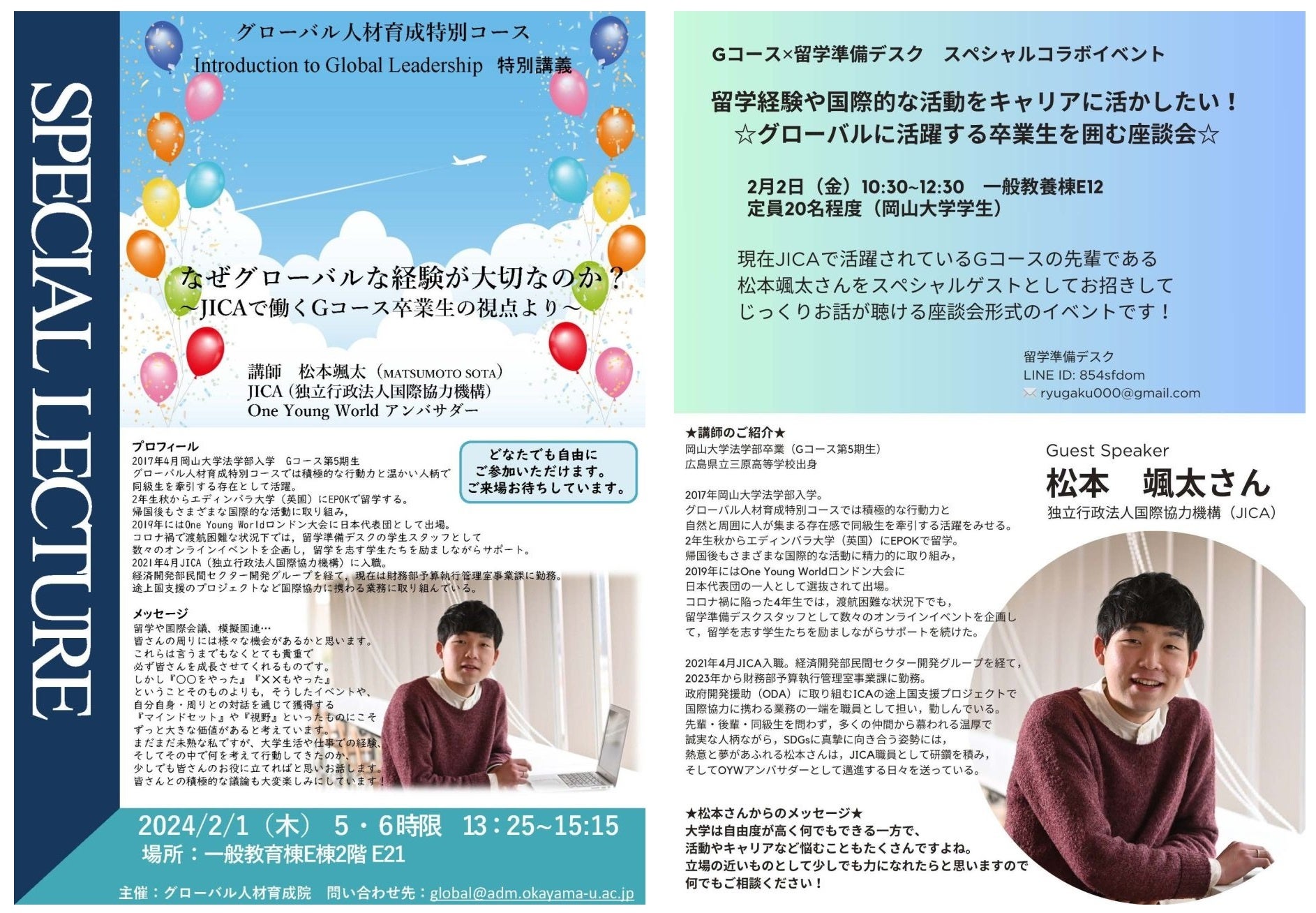 国立大学法人岡山大学(本部:岡山市北区、学長:那須保友)のグローバル人材育成特別コースは、2024年2月1日、本学法学部卒業生でグローバル人材育成特別コース(Gコース)第5期生でもある松本颯太さんを講師として招き、特別講義を開催しました。
