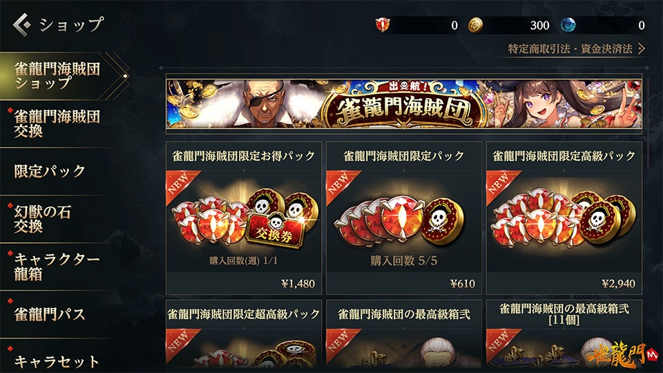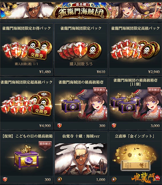 龍宝をお得に購入できる特別なパック商品や、「出航!雀龍門海賊団」イベント限定アイテムが出現する最高級箱などをご用意しました。
