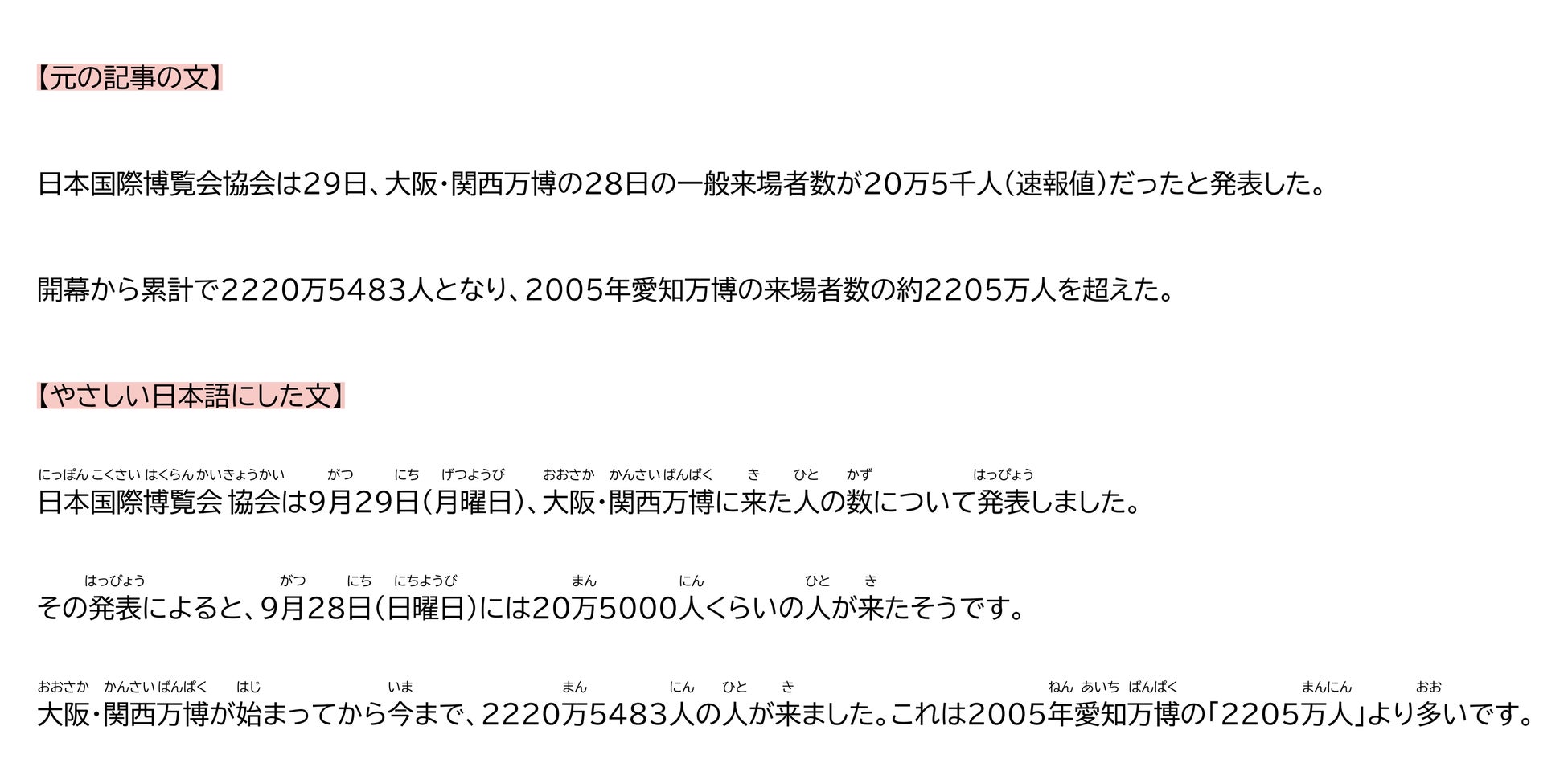 やさしい日本語への言い換えでは、日本語を学んだことがある外国人の方が理解しやすい文法や言葉を使うように意識しています。また、アルファサードが開発したシステムを使い、漢字の上にルビを振る設定のほか、単語と単語の切れ目をわかりやすくするスペースを入れる「分かち書き」の設定や、記事のテキストを音声で読み上げる機能も利用できます。元の記事へは、「元の記事・関連情報」から遷移できます。