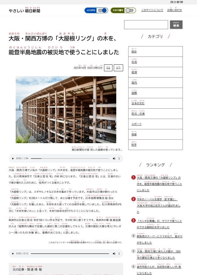 株式会社朝日新聞社(代表取締役社長CEO:角田克)のグループ会社であるアルファサード株式会社(代表取締役社長:森崎賢太郎)は、朝日新聞社との合意のもと、2025年10月14日、朝日新聞のニュースをやさしい日本語で伝えるメディア「やさしい朝日新聞」を公開しました。 アルファサードは、ウェブ上の情報を利用しやすくする「ウェブアクセシビリティ」を重視し、やさしい日本語の作成支援技術を強みとしています。やさしい日本語で、ニュースをもっと多くの人に届けていきます。