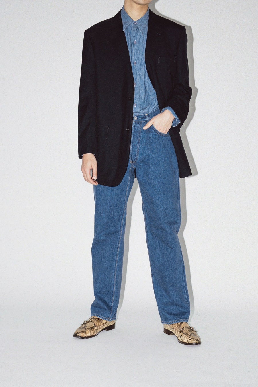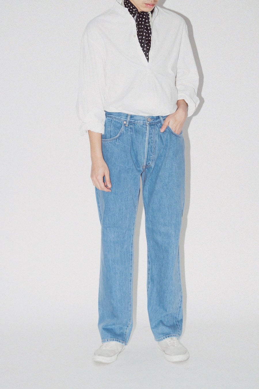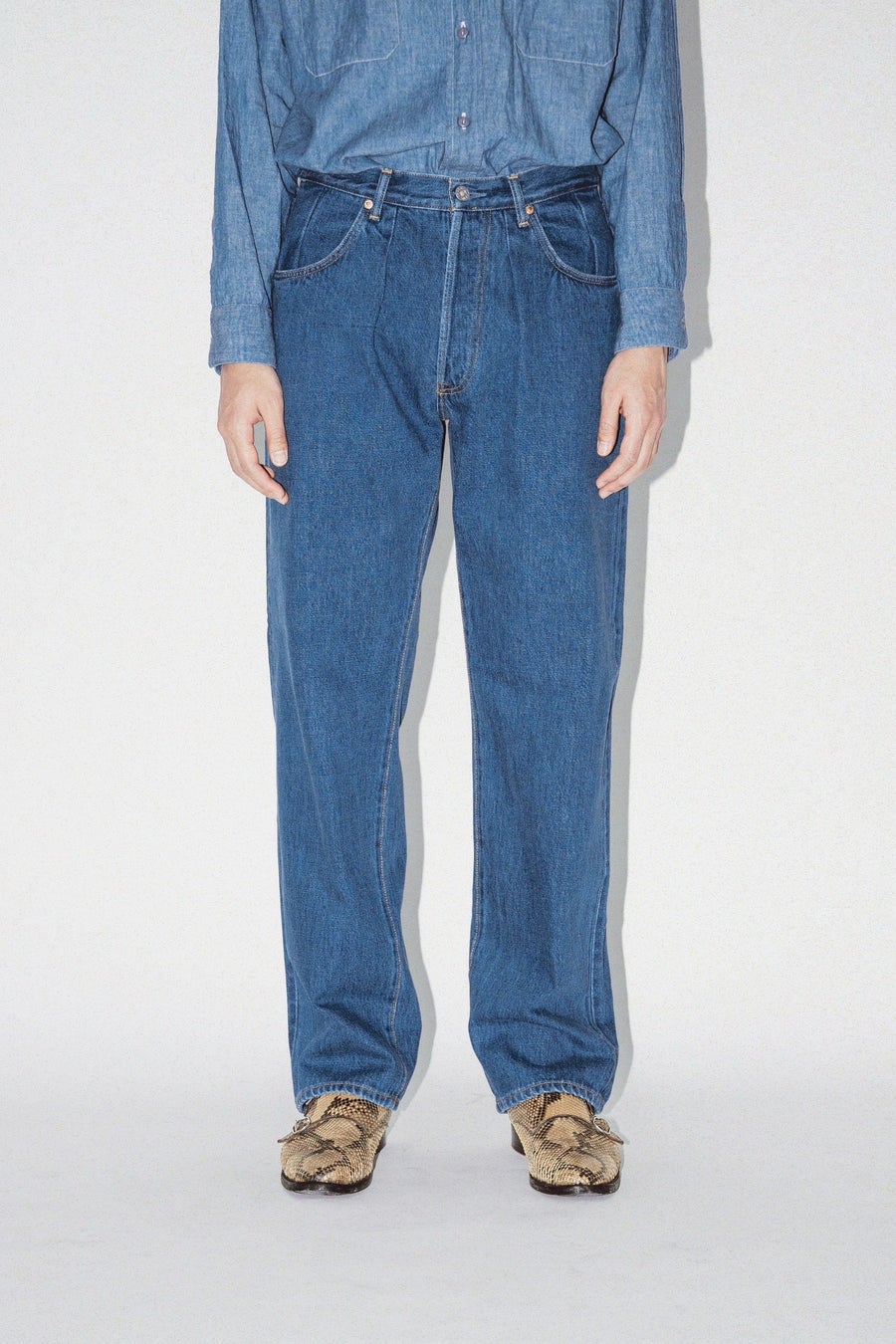 ウォッシュされた平坦なカラーにウエストのワンタック。程よくワイドなシルエット。重すぎず、軽すぎないオンス。上品でありながらラフで、いわゆるヴィンテージの縦落ちやリジッドの精悍な印象とは全く異なる、洒脱な空気を纏っている。