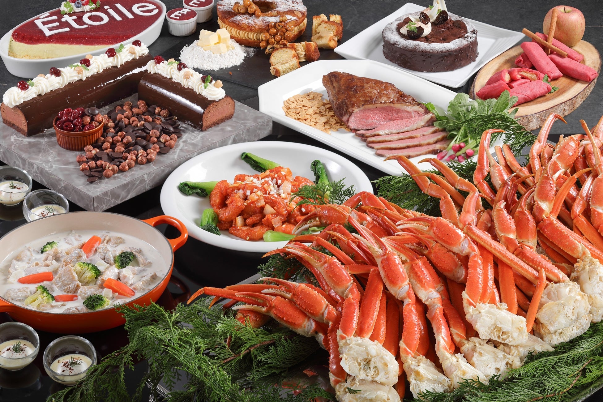 スカイレストラン エトワールでは、毎年好評の「本ズワイ蟹食べ放題」を本年もご用意しました。贅沢な冬の味覚「本ズワイ蟹」を心ゆくまでご堪能いただけるとともに、ホテルシェフが焼き上げるジューシーな「US プライムビーフとAU 牛モモ肉を使用したローストビーフなどをお楽しみください。また、2層のムースで仕上げたミロワールショコラなど、バリエーション豊かなスイーツもご用意しておりますので、お食事後にお楽しみください。
