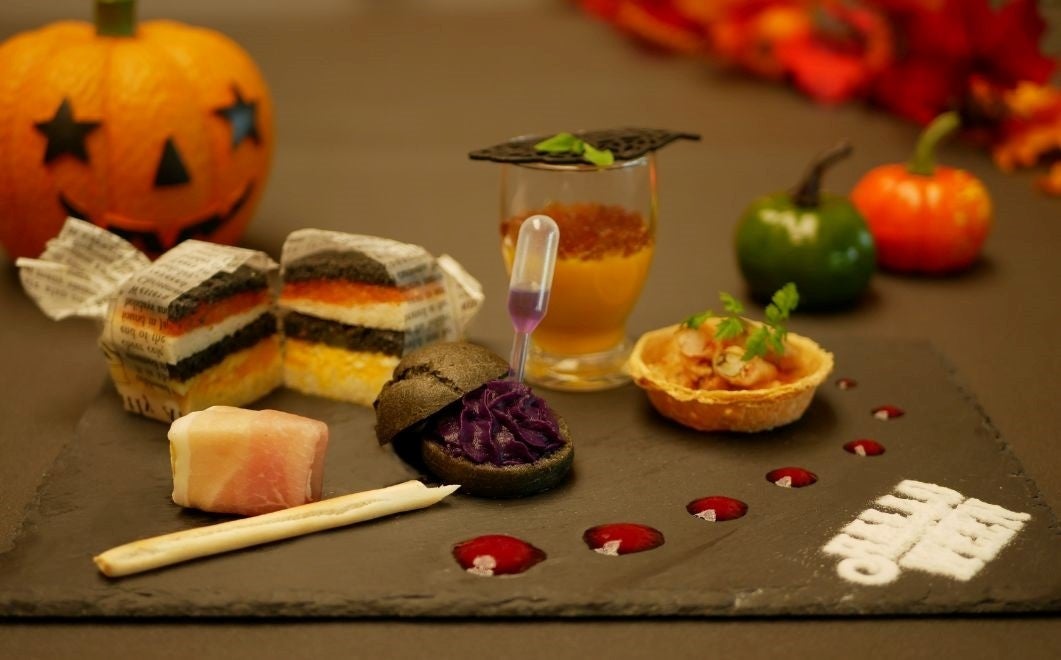 中世ヨーロッパの古城を思わせる箱根仙石原プリンスホテル。箱根外輪山の雄大な自然を望むレストラン「グリル」の大きな窓にキャンドルやランタンのやさしい灯りが反射し、まるで絵画のような景色が広がります。ハロウィーン限定のアペタイザーやカクテルもご用意しております。