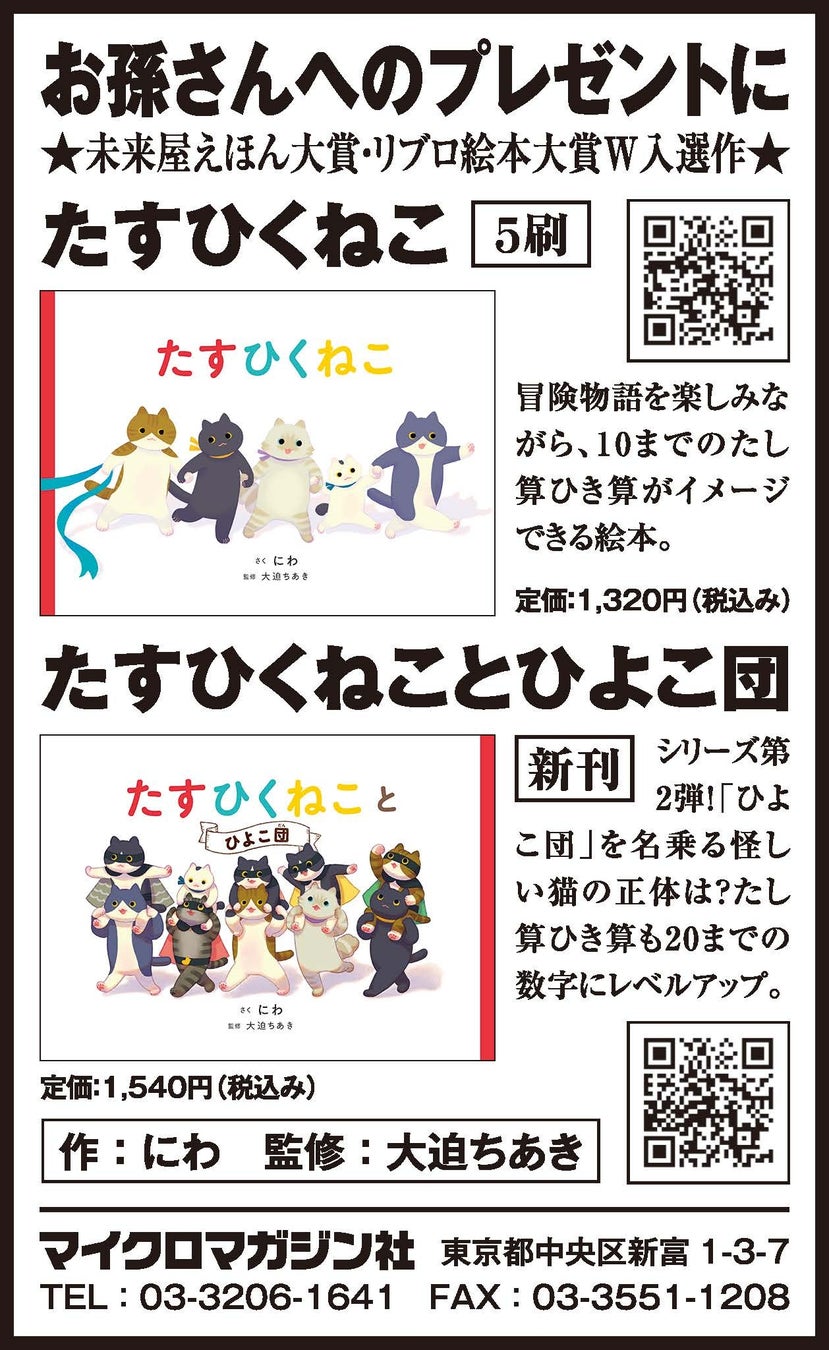 未来屋えほん大賞・リブロ絵本大賞にW入選「楽しく数が学べる」「自然と算数が身につく!?」と大人気!絵本『たすひくねこ』と続編『たすひくねことひよこ団』を12月15日(日)の朝日新聞に掲載いたしました。