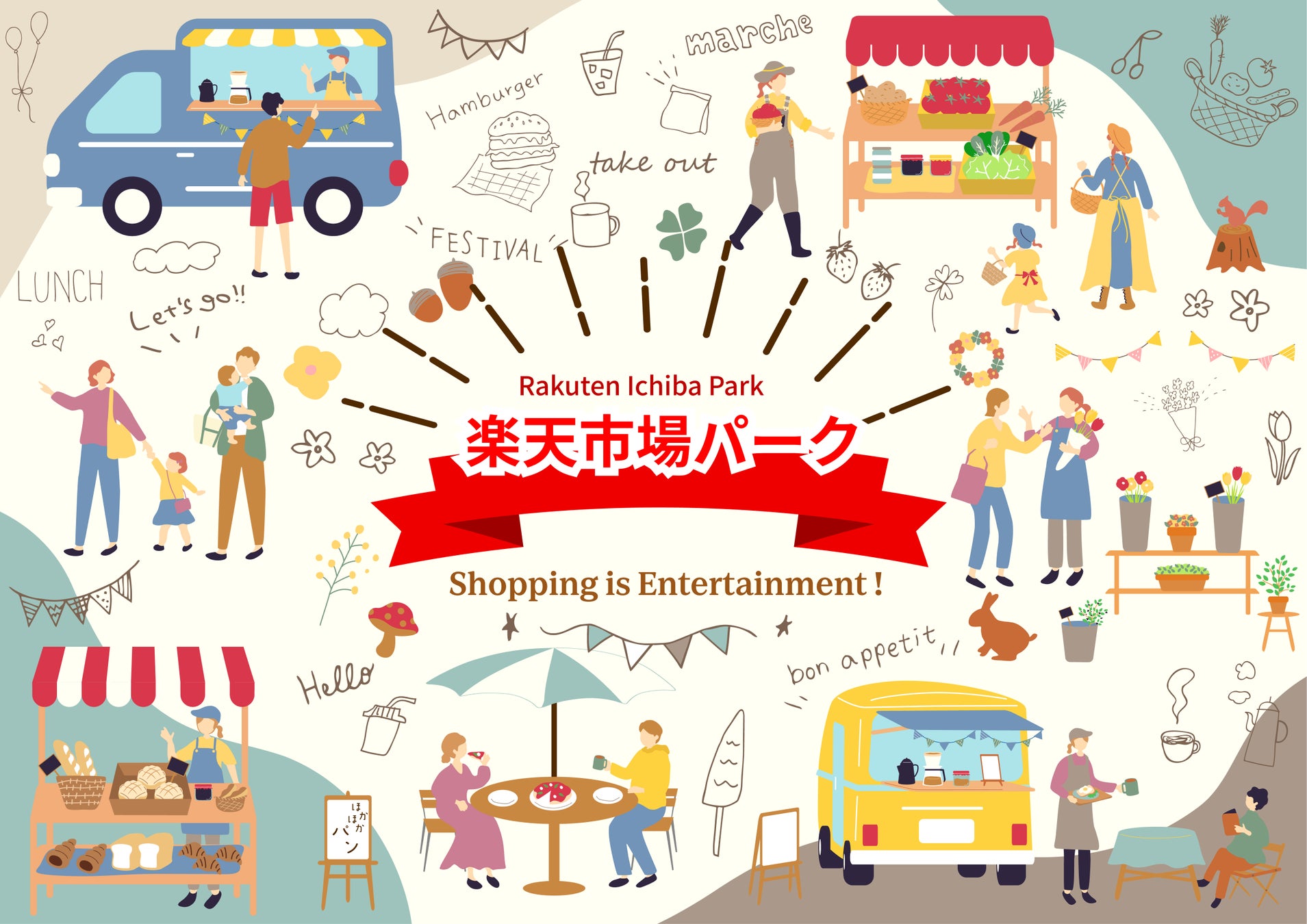 新しく公開された「フューチャーフェスティバル」内の「楽天市場パーク」は、「楽天市場」出展店舗の商品購入やグルメをお楽しみいただけるコーナーです。「楽天市場」で人気の夏にぴったりなひんやりスイーツや本イベントでしか味わえない限定グルメのほか、ご家族で夏を快適に楽しく過ごしていただくための雑貨やアウトドア商品なども用意しています。また、「人をダメにするクッション」を販売している「ハナロロ クッション・ソファの店」では、サステナブルなビーズクッション「SDBs」(持続可能なビーズ)のぬいぐるみに色を塗ったり、生地を貼ったりしてオリジナルのぬいぐるみを作る、SDGsワークショップも開催予定です。「楽天市場パーク」を通じて、“Shopping is Entertainment!”を体感していただけます。