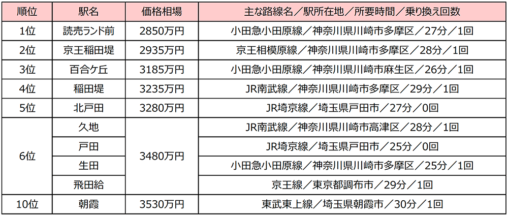 2位京王稲田堤駅と4位稲田堤駅は歩ける近さに位置していますが、実は3位百合ヶ丘駅と6位生田駅も1位読売ランド前駅の両隣という近接した位置関係。そして前述のように読売ランド前駅と京王稲田堤駅は2kmほどしか離れていません。つまりこの5駅は近い範囲に集中しています。5駅ともに、東京と神奈川を隔てて流れる多摩川のほど近く。住所としては神奈川県川崎市ですが、新宿駅まで30分以内で行けるほど都心部に出やすく、その割に周辺には生田緑地をはじめとした自然を身近に感じられるスポットも残されています。そして、新宿駅(価格相場8430万円)に比べて2分の1以下の予算で住まいが探せる点も魅力的です。「新宿駅までアクセスしやすい街」というと都内に目を向けがちですが、日ごろは東京都外ののんびりと子育てできる街で暮らし、必要に応じて便利な電車網を活用してサッと新宿へ……という暮らし方もよさそうです。