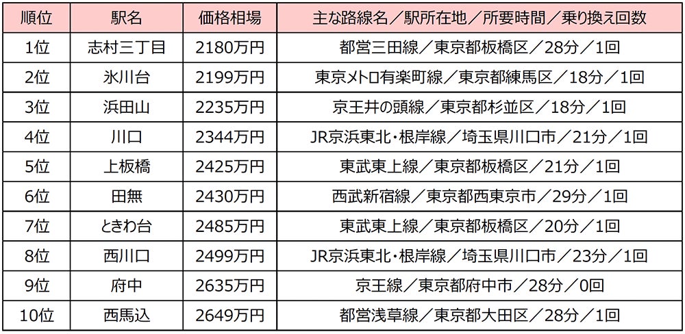 <新宿駅まで30分以内、中古マンションの価格相場が安い駅をランキングTOP10シングル編>